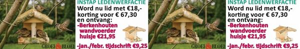 De Kerstledenwerfactie is afgelopen en er is nu een nieuwe ledenwerfactie, namelijk de instapledenwerfactie. Het welkomstcadeau is het Berkenhouten wandvoederhuisje ter waarde van €21,95. Nieuwe leden kunnen nu dus lid worden voor € 67,30 i.p.v. €85,30 (periode maart-december) en een jaarabonnement 2026 kost €94,75.