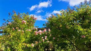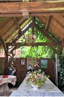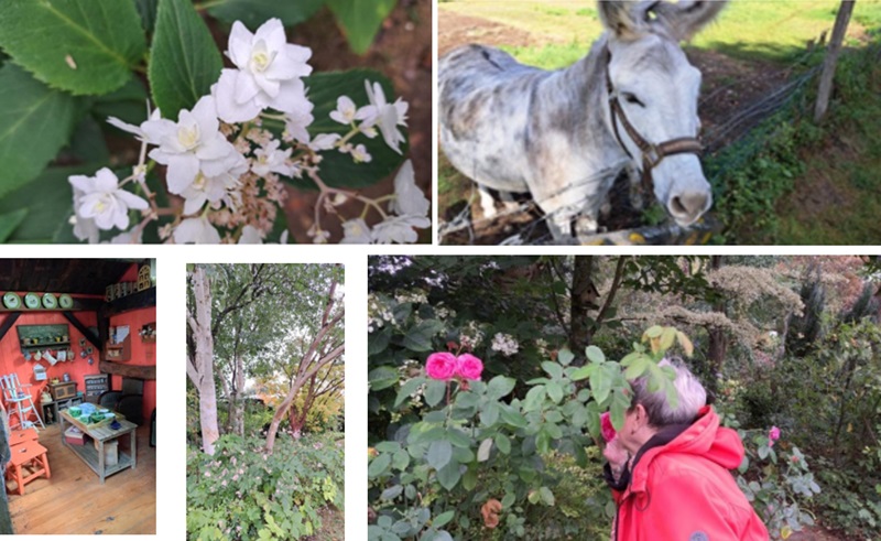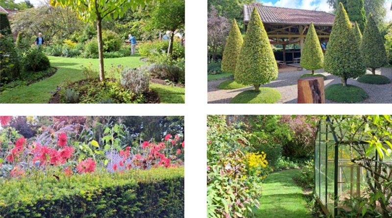 Weer terug in de bus, gaan we op weg naar Jardin des Lianes in Cheriennes in Frankrijk. De tuin heeft het predicaat ‘Jardin Remarquable’ gekregen. Ook voor ons is het een tuin met een gouden randje. Een lief echtpaar ontvangt ons en zij vertellen dat zij veertig jaar geleden zijn begonnen met deze tuin. Zij beoogden een vrije, romantische en toch wilde tuin van 5.400 m2 aan te leggen die gemakkelijk te onderhouden zou zijn. Drie hoofdthema’s zijn: de bomen, Hydrangea’s en de geurende rozen. Wat een mooie tuin. Hoewel de eigenaren excuses maken omdat de tuin er nu uitziet zoals normaal in oktober. Dat komt uiteraard door de lange droge perioden. Er zijn nl al bomen die hun bladeren laten vallen. Je kunt eindeloos door de bostuin wandelen en we worden steeds opnieuw verrast door de grote verscheidenheid van prachtige hortensia’s en geurende rozen. Ook de vele bomen met prachtige stammen geven een overweldigende indruk.