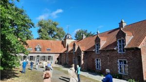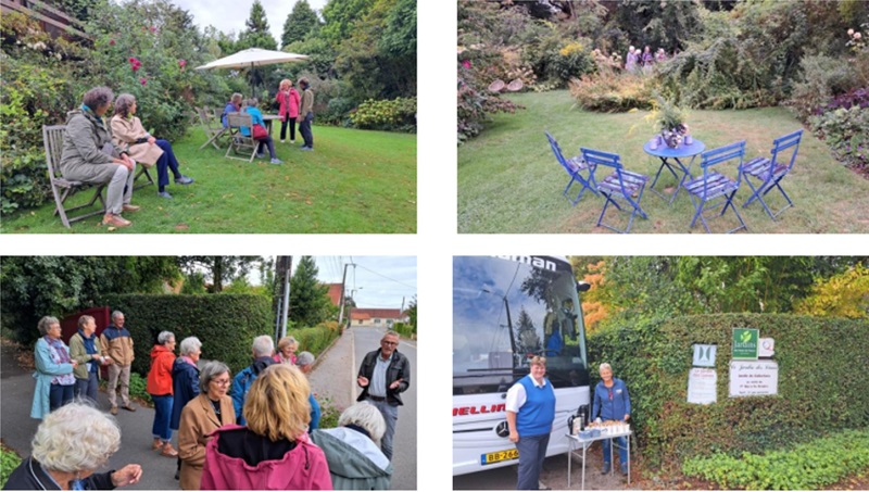 Al om kwart voor acht worden we verwacht op de verzamelplaats op het Zep-terrein. We worden verwelkomd door Liesbeth, Sietske en Hermine, onze reisgids. En wat leuk, onze buschauffeur Miranda is er ook weer; zij is al druk bezig alle koffers in de kofferruimte een plaatsje te geven. Iets na achten vertrekken we met 34 mensen richting Frankrijk. Volgens Liesbeth krijgen we vier dagen droog weer, maar anderen hebben een andere voorspelling gezien; we gaan het allemaal beleven. Via Gent rijden we naar de Westouter in België, waar we na een kleine wandeling terechtkomen in de Westhoek Garden van Willy en Henriette Lievens-Gevaert. Een ouder echtpaar, die tijdens hun werkzaam leven in de Mode-industrie zaten. Toen zij nog werkten hebben ze tijdens hun verlof veel tuinen bezocht, voornamelijk in Engeland. Dit was de aanleiding om na hun pensionering zelf een tuin te ontginnen, want dat was het wat ze kochten: een ruïne met 50 ha grond.