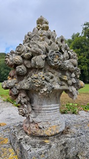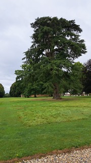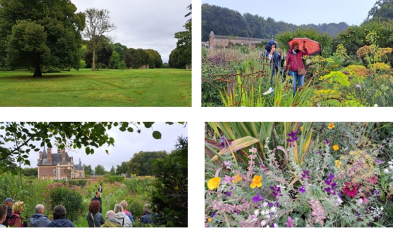 Vanuit het kasteel stapten we op het bordes en hadden zicht op een gazon omringd door majestueuze bomen. Het gazon was niet een strak Engels gazon maar werd gemaaid op Franse wijze met een patroon van hoge vierkanten en lage paden. Bij dit uitzicht hoorde het “aha” effect: een vanuit het huis onzichtbare afscheiding. De illusie wordt gewekt dat de tuin één geheel vormt met het uiteindelijke landschap. En dat gebeurde hier heel duidelijk. Interessant te horen dat het “aha” geen vertaling behoefde: dat is een internationale uitdrukking.