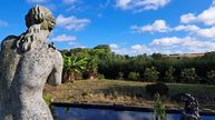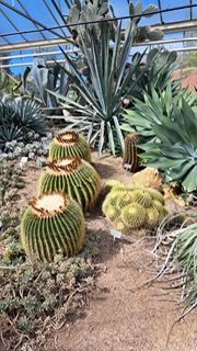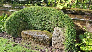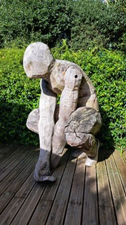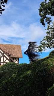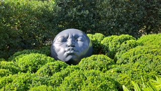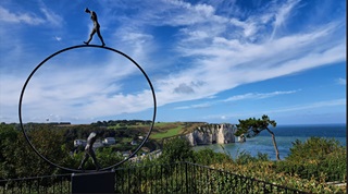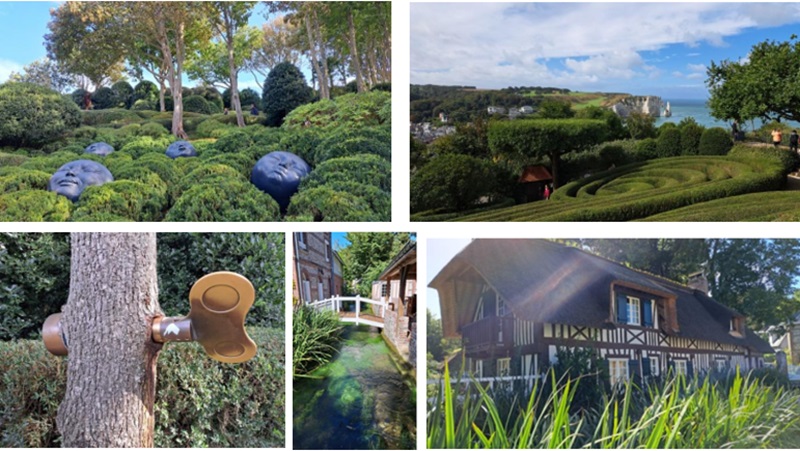 De Jardins d’ Étretat en de zout-resistente beplanting die in het begin van de vorige eeuw ontworpen en ingeplant is, is niet eenvoudig te beschrijven en ook niet goed te fotograferen; je moet hem ‘ondergaan’ door te lopen door de steile slingerende paadjes en trappen onder oude bomen, langs mee-slingerende perfect in model geschoren buxus-hagen en kleine en grote héél verschillende kunstobjecten. Dit alles als een eerbetoon aan artiesten als Monet, maar ook hedendaagse kunstenaars. Tussen die slingerende en spiralende buxus-hagen lagen grote (doorsnede tot wel een meter) grijze glimmende ballen met gezichten met verschillende uitdrukking die ik misschien het beste met ‘bolle toeten’ beschrijf