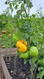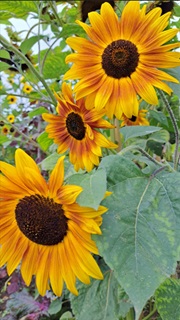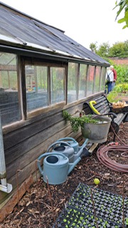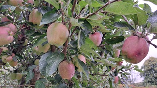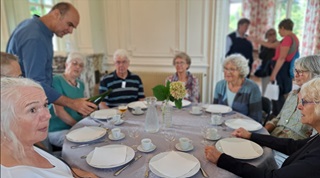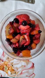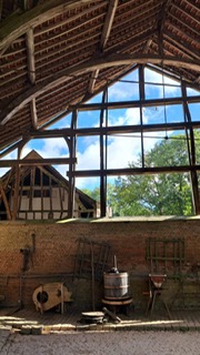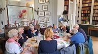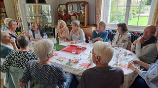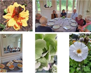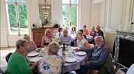 Van daar liepen we naar de ommuurde tuin waar we “vrij” gelaten werden. Wat een kleurenweelde en diversiteit aan gewassen. Een prachtige “potager” met bloemen, fruit en groenten. Dit alles onder een bewolkte hemel met aan het eind van de morgen wat lichte motregen. De lunch werd geserveerd in het bijgebouw. Op tafel kwamen vleeswaren, rijke salades en brood en op elke tafel twee flessen cider. Dit alles werd afgesloten met een flinke fruitsalade waarbij het opviel hoe klein de fruitstukjes gesneden waren wat een teken was van de verfijnde zorg die aan deze lunch besteed was. Na nog een kopje koffie weer de bus in.