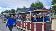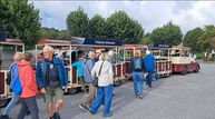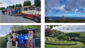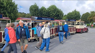 Maar vandaag zag het er goed uit en moesten we al vroeg (8.30 h) in de bus om op tijd in Étretat de wonderbaarlijke Jardins d’ Étretat te bezoeken die voor velen van ons slechts te bereiken was op de hoge kliffen rondom de oude havenstad met een trammetje vanuit het centrum voorafgegaan door een ‘locomotiefje’ op benzine dat schokkend en slingerend door de nauwe straatjes van het centrum en vervolgens via een weg met haarspeldbochten naar de top van de klif en ingang van de tuin klom. Wat een uitzicht over de haven, het kiezelstrand en omringende krijtrotsen aan zee!