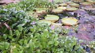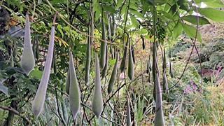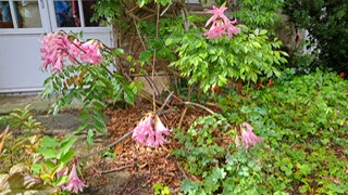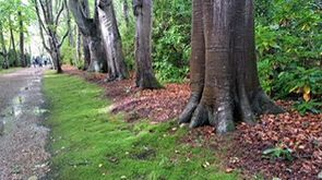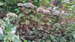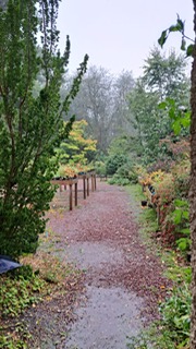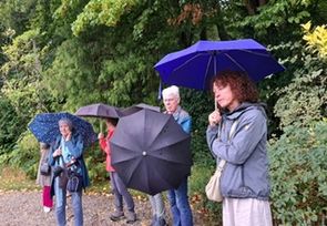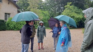 Met een busrit van een half uur kwamen we aan bij de tuin Le Vasterival, vlak aan de kust. Donkere wolkenluchten hingen boven ons toen de vrouwelijk tuinchef in helder Engels (geen “alo, alo”) begon aan haar inleiding. De tuin is een schepping van prinses Stürdza, een dame (alweer!) van Noorse komaf die haar titel te danken had aan een huwelijk met een Roemeense prins. De omschrijving van de tuin in de reisgids had grote verwachtingen gewekt en iedereen keek vol verlangen uit naar dit bezoek. Maar helaas, de wolken werden donkerder en snel moesten extra paraplu’s aangedragen worden en regenjassen aangetrokken. Ondanks de nattigheid ging de groep de tuin in maar spoedig werd het te bar met de regenval. Door de hoogteverschillen veranderden gazon en paden in watervallen en werd de situatie onder de hoge bomen te precair. De 4 tuinlieden dreven de tuinliefhebbers de heuvel op, weg uit de gevarenzone. Er kwam later wel een mager zonnetje maar de bodem was te nat en te glad om gevaarloos te betreden. Drie deelnemers hadden zich wijselijk in het wc-gebouw schuilgehouden en ontsprongen de koude douche. Het bezoek is letterlijk in het water gevallen.