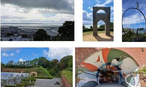 We keerden terug naar het oude centrum ook weer in het trammetje en werden bij de eindhalte losgelaten voor een ruime lunchpauze met zakgeld van de organisatie als compensatie voor de teleurstelling van de vorige dag. Er was een gezellige koopstraat en een levendige weekmarkt. Voor ieder wat wils. Het geplande bezoek aan de door onze voortreffelijke gids Hermine niet eerder bezochte Les Jardins Suspendus in Le Havre werd onderweg ernaartoe verstoord door een pijnlijk incident met heet water uit een thermoskan met een nare brandwond met blaren als gevolg, die uiteindelijk toch zorgvuldig behandeld konden worden met een aparte rit naar een ’Pharmacie’. Achteraf begrepen wij - met Hermine! - niet waarom de tuinen ‘Hangende Tuinen‘ werden genoemd in een hoog boven de stad gelegen monumentale militaire vesting, waarvan de bouw was begonnen in 1856 en nooit het verdedigende doel voor de stad noch voor Frankrijk, heeft gehad; behalve misschien voor Nazi-Duitsland als deel van de ‘Atlantic Wall’ tegen een geallieerde invasie in de Tweede Wereldoorlog. Vanaf deze wallen een schitterend uitzicht over Le Havre en zijn havens.