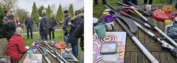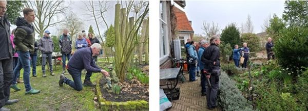 We werden hartelijk ontvangen door de tuineigenaren met koffie, thee en zelfgebakken cake. Het weer zat op 28 februari niet mee, het was koud, nat en winderig. Op 7 maart was het weliswaar koud maar gelukkig droog. Toch heeft iedereen het tot het einde volgehouden, waarschijnlijk omdat het boeiend was en er veel adviezen werden gegeven.