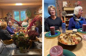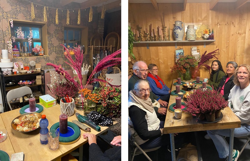 Ilse had gezorgd voor veel ander materiaal zoals besjes, pluimpjes, strobloemetjes en noem maar op. Ieder was heerlijk bezig, het was heel gezellig. We hadden tijd genoeg, het was heel ontspannend.