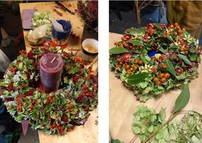Middenin de krans komt een kaars in bijpassende kleur. We hebben eerst een compacte basis gemaakt met hortensia.Ja, dat lijkt makkelijk, maar om de krans mooi compact te krijgen viel nog echt niet mee. Gelukkig was Ilse daar, met raad en daad, als het nodig was.